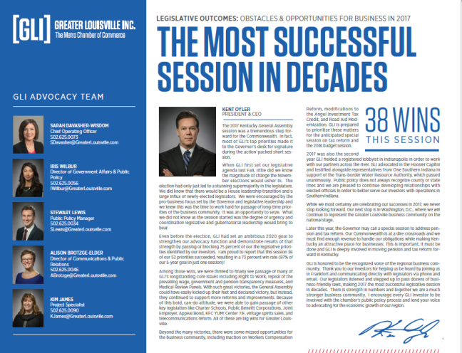 The 2017 Kentucky General Assembly session was a tremendous step forward for the Commonwealth. In fact, most of GLI’s top priorities made it to the Governor’s desk for signature during the action-packed short session.