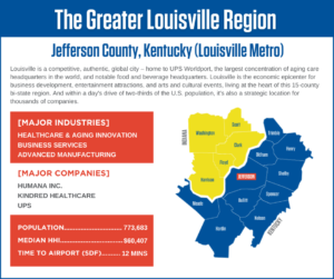 The Greater Louisville region is made up of 15 counties surrounding the Greater Louisville and Southern Indiana areas, home to more than 1.4 million people and over 58,000 businesses. The unique advantages of the region’s strategic location (within a day’s drive of two-thirds of the U.S. population), and outstanding quality of life cannot be over-stated. The region offers varied landscapes and lifestyles for any type of company and every type of person.