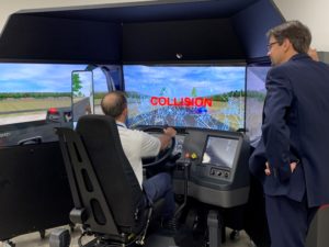 James Clarke, Vice President of Information and Technology at Mister “P” Express, assists Chad Deters, Sales Manager at Advance Ready Mix Concrete, Inc., with a driving simulator