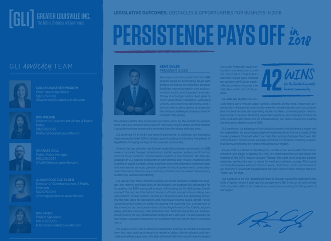 On the local, state, and federal levels, GLI produces publications to inform policymakers and the business community about key issues and initiatives that will move the Greater Louisville region forward. Check here to see what concepts GLI will be promoting or to see how policymakers have chosen to stand for business.